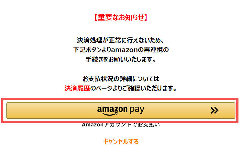 1度決済が失敗いたしますと、Amazon payとの連携が解除されます。