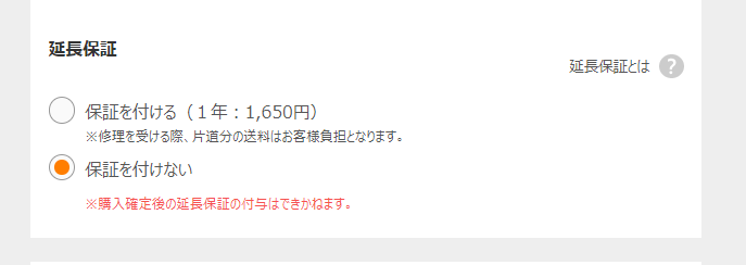 ご購入時には、有料で延長保証の申請がおこなえます。延長保証内容は下記ご参照ください。https://mall.air-closet.com/static/purchase/warranty/※一部商品は延長保証をお選びいただけません。