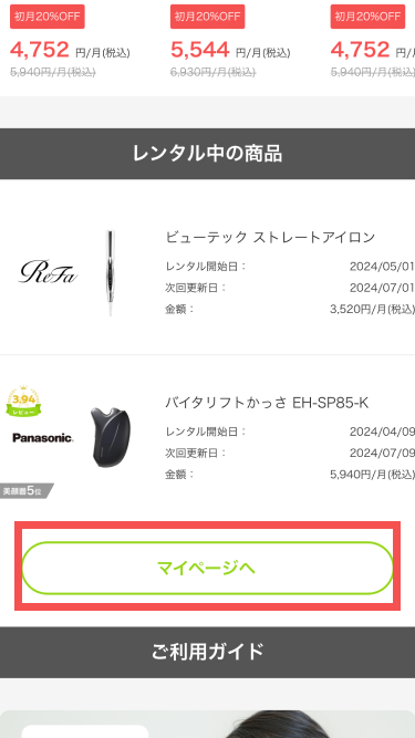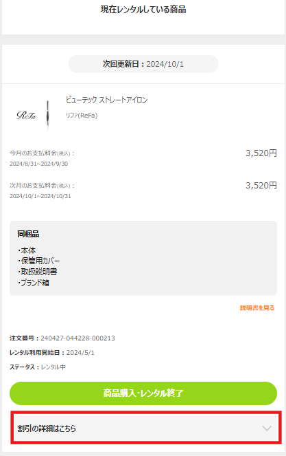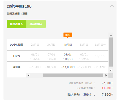現在レンタルしている商品購入価格はマイページよりご確認いただけます割引の詳細を押す現在の購入金額が表示されます。レンタル期間が最大割引月を過ぎている場合は、購入金額が一律となるため、〇ヶ月~の位置になります。